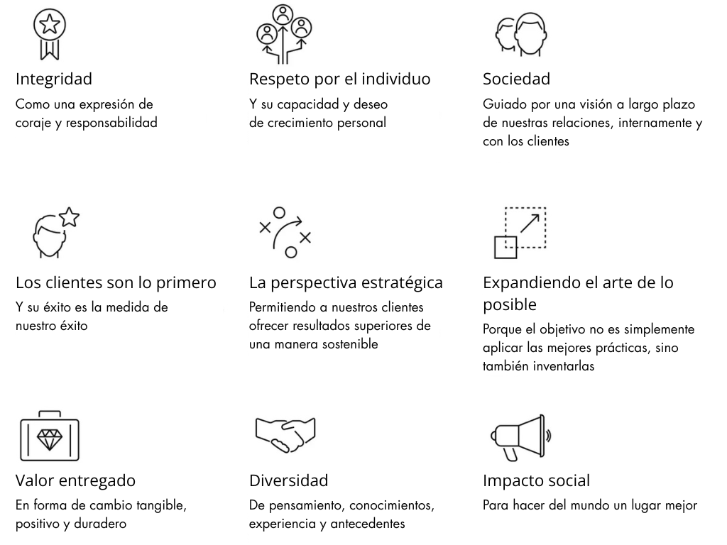 Mantener una cultura sólida, basada en valores claros y comunicados con frecuencia, es fundamental para que BCG sea líder en el mercado. Nos comprometemos con los más altos estándares de ética, conducta empresarial y principios corporativos, y se espera que todos nuestros empleados los respeten.